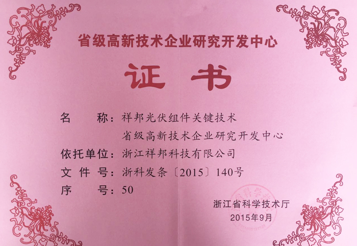 祥邦光伏組件關(guān)鍵技術(shù)省級(jí)高新技術(shù)企業(yè)研究開發(fā)中心